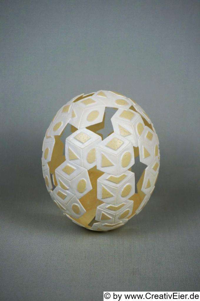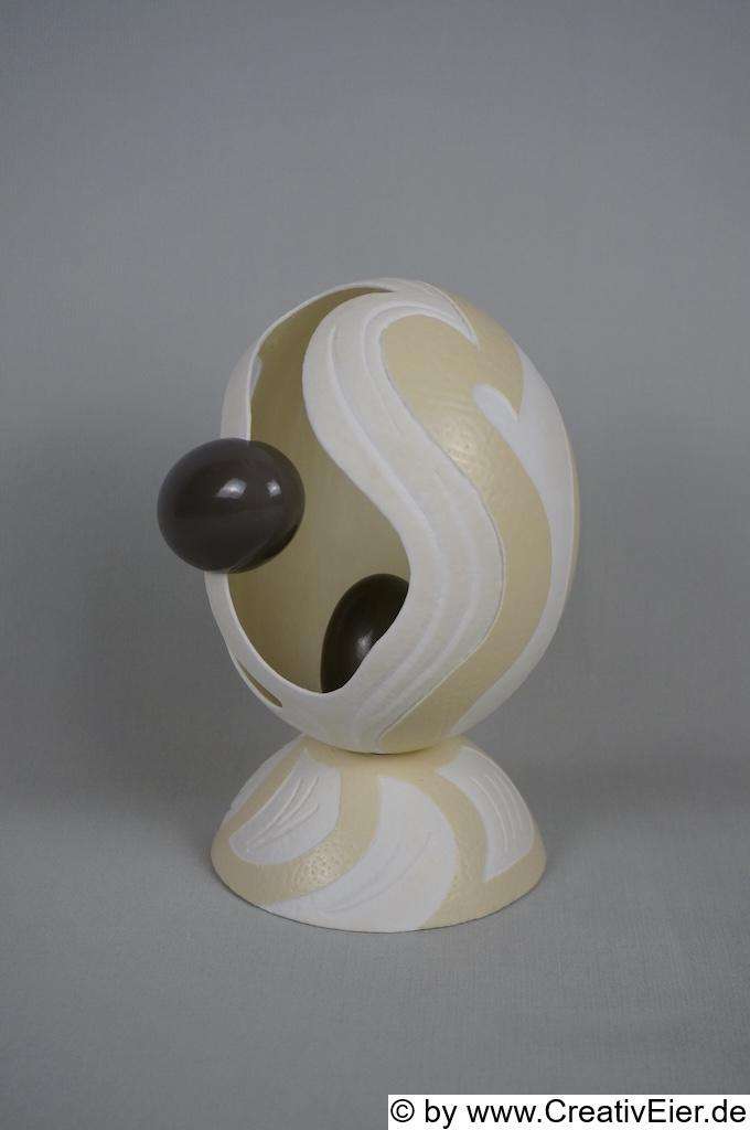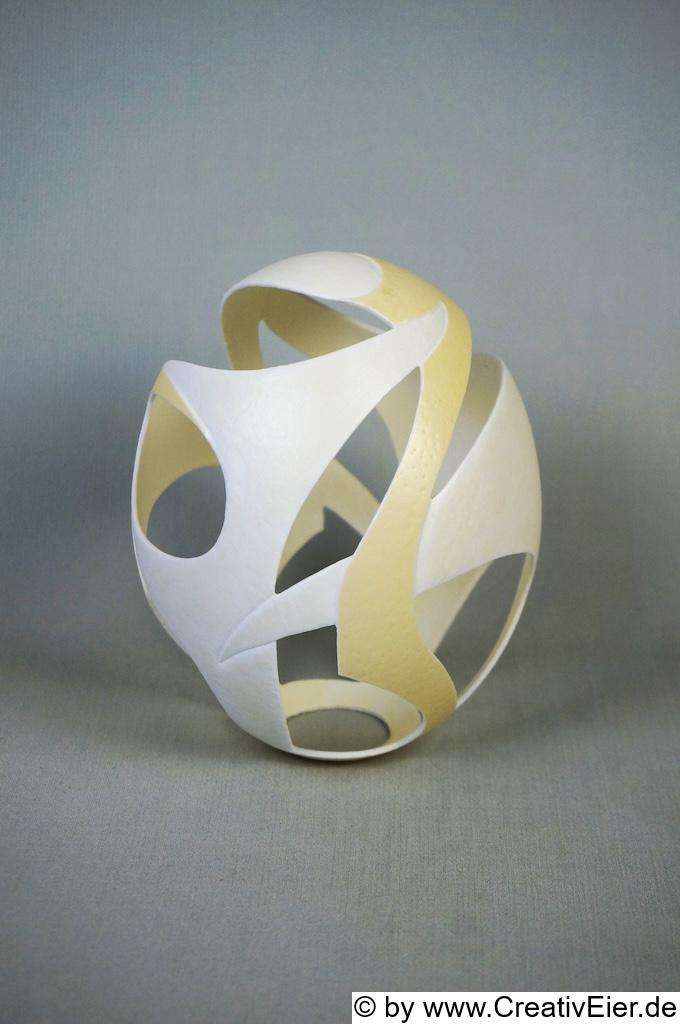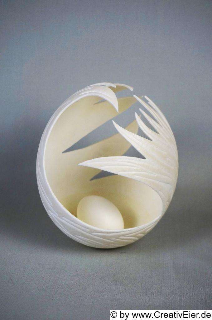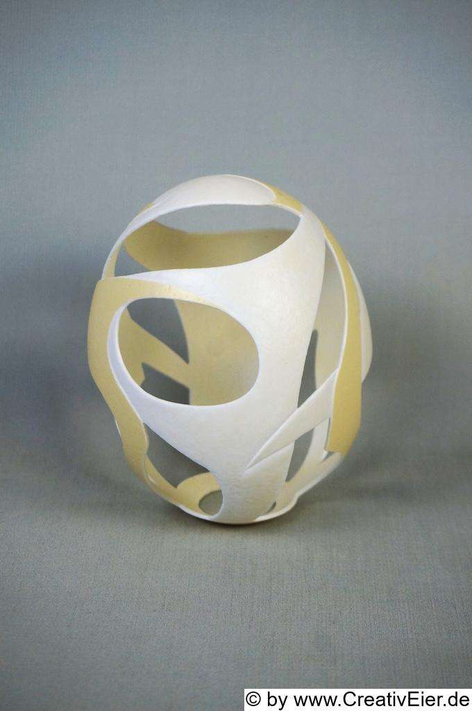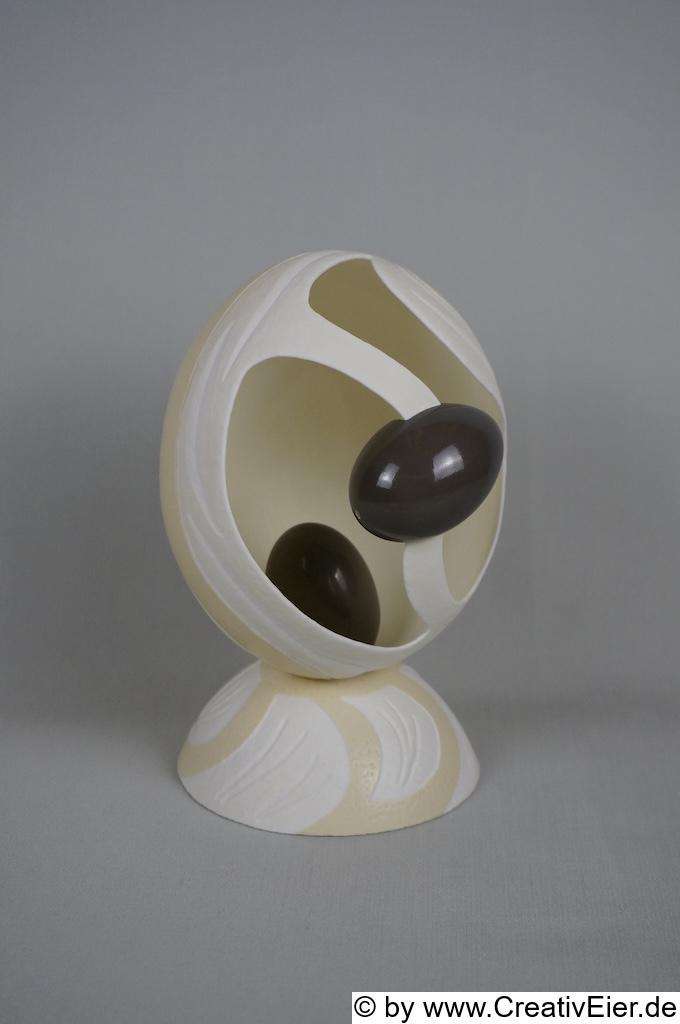 Auf diesem Bild werden perforierte StraußenEier gezeigt, das ZahnradEi, das FedernEi, das Ei-in-Ei und das TropfenEi.