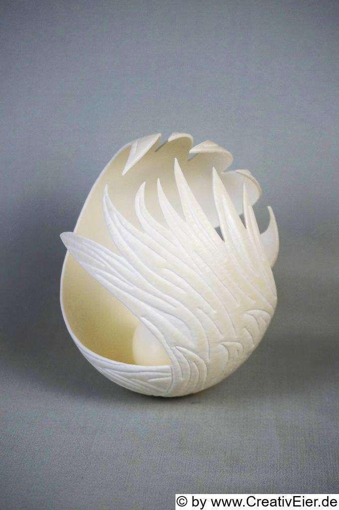 StraußenEier sind etwa 19cm hoch und 15cm breit und ihre Schalendicke beträgt ungefähr 2,5mm. Entsprechend der Motive wird das StraußenEi graviert, gefräst und gebohrt.
